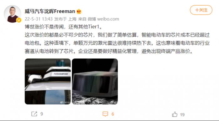 ”博世涨价不是传闻,还有其他Tier1。简单估算,智能电动车的芯片成本已经超过电池包。”5月末他在微博中表达了担心。