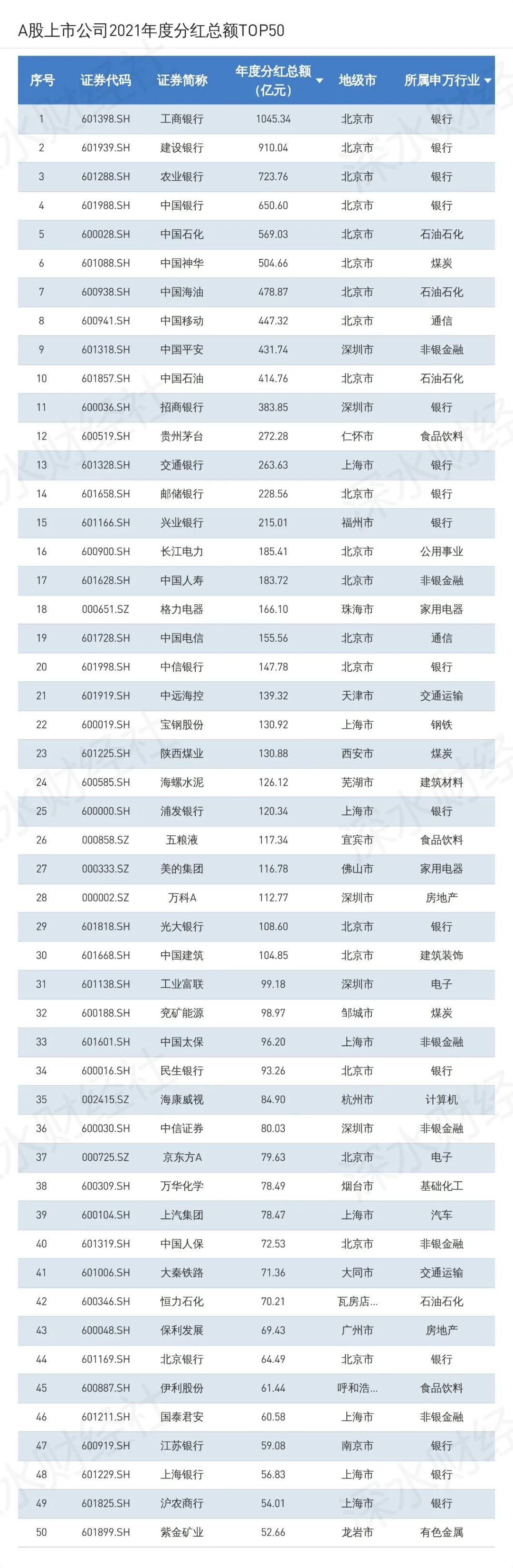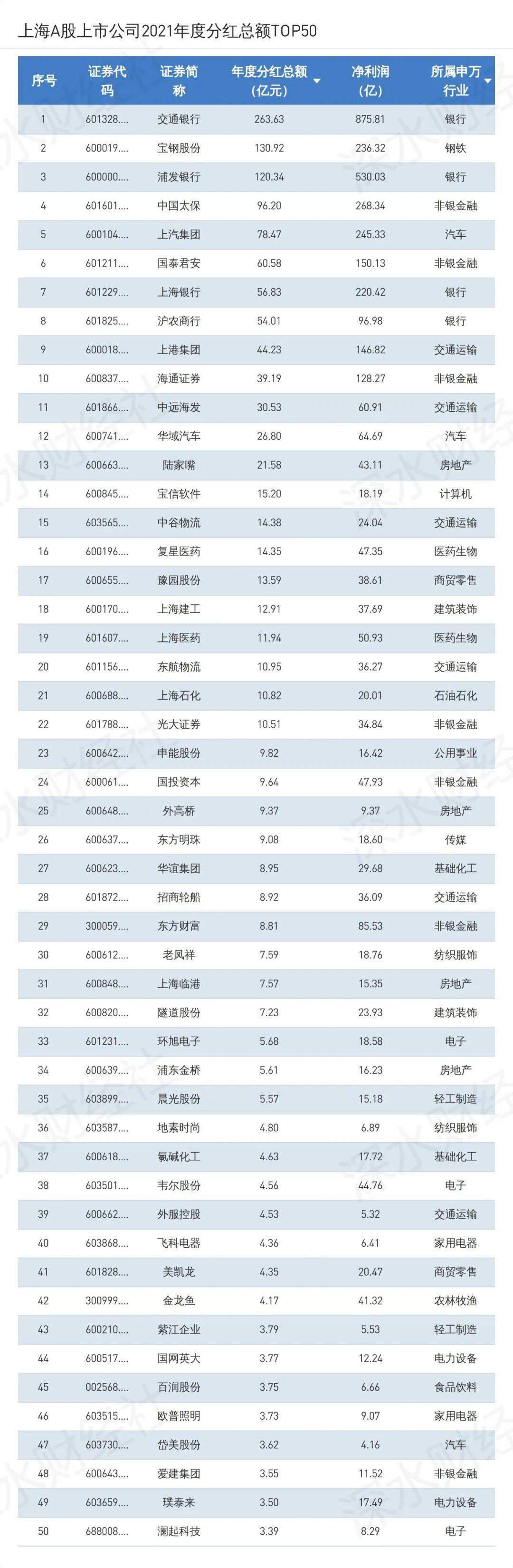 今天,我们深水财经社正式发布《上海A股上市公司2021分红榜》,让大家了解去年上海上市公司利润分配情况。