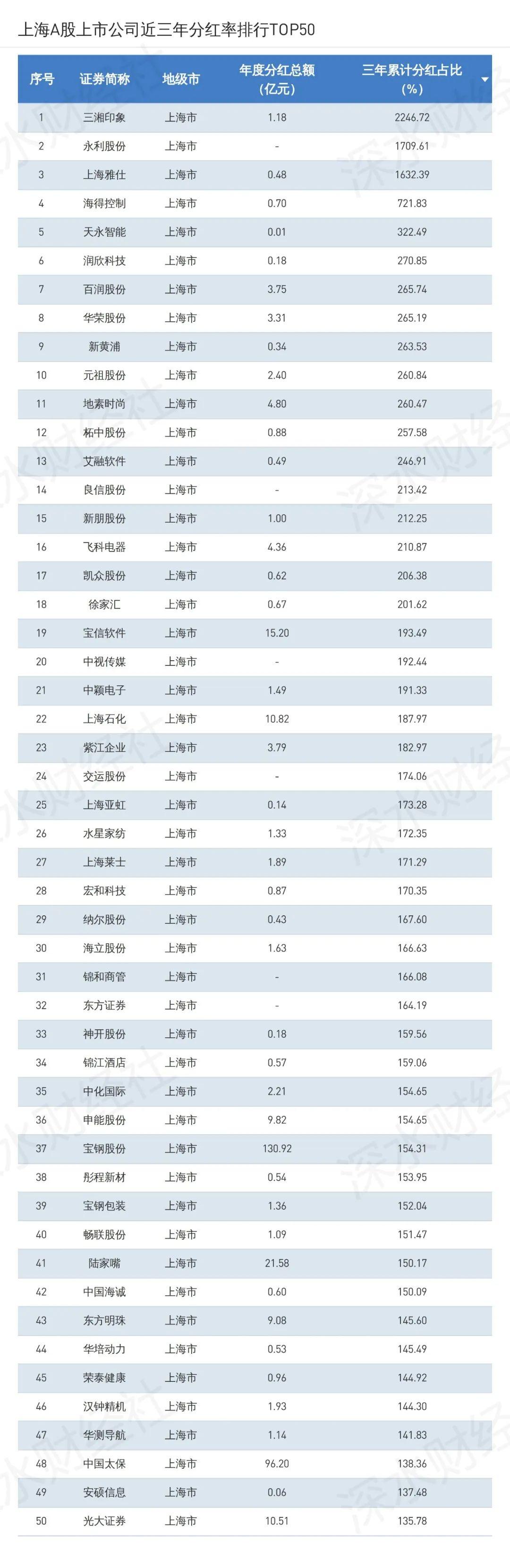 我们还统计了上海上市公司近三年分红率情况,三湘印象、永利股份、上海雅仕位居前三位。