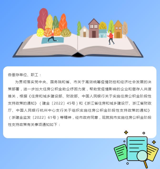 为贯彻落实党中央、国务院和省、市关于高效统筹疫情防控和经济社会发展的决策部署,进一步加大住房公积金助企纾困力度,帮助受疫情影响的企业和缴存人共渡难关,根据《住房和城乡建设部、财政部、中国人民银行关于实施住房公积金阶段性支持政策的通知》(建金〔2022〕45号)和《浙江省住房和城乡建设厅、浙江省财政厅、中国人民银行杭州中心支行关于组织实施住房公积金阶段性支持政策的通知》(浙建金监发〔2022〕61号)等精神,经市政府同意,现就我市实施住房公积金阶段性支持政策有关事项通知如下: