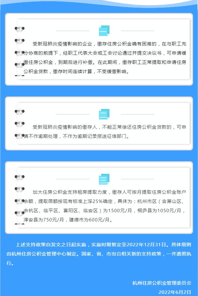 上述支持政策自发文之日起实施,实施时限暂定至2022年12月31日。具体细则由杭州住房公积金管理中心制定。国家、省、市出台相关新的支持政策,一并遵照执行。