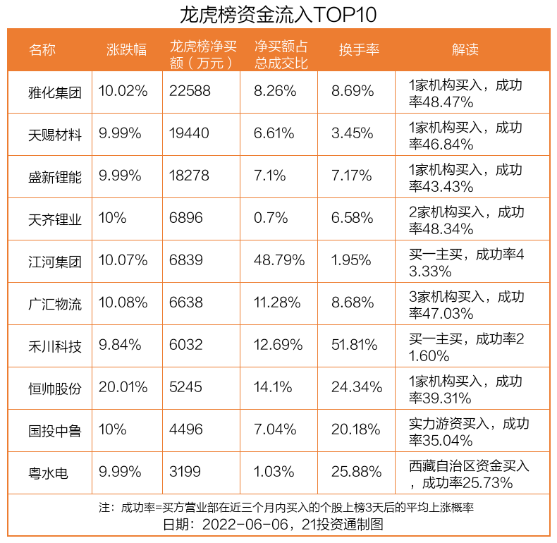 6月6日,上证指数上涨1.28%,深证成指上涨2.66%,创业板指上涨3.92%。盘后龙虎榜数据显示,共有76只个股因当日异动登上龙虎榜,资金净流入最多的是雅化集团(002497.SZ),达2.26亿元。