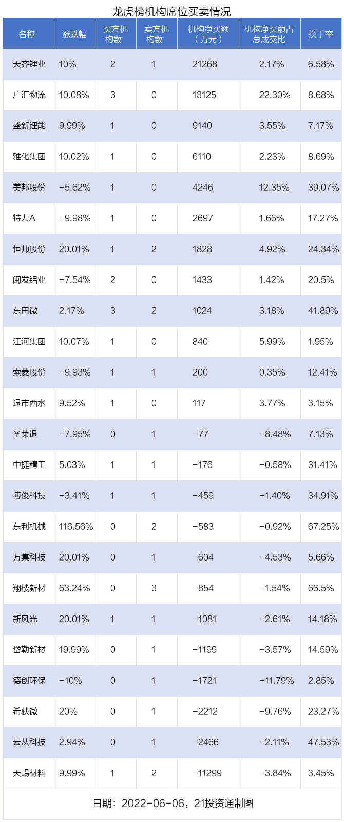 其中,机构净买入金额最多的是天齐锂业(002466.SZ),当日收盘上涨10%,换手率为6.58%。