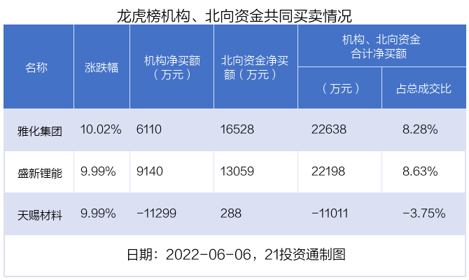 值得注意的是,机构和北向资金共同净买入了雅化集团,盛新锂能;在天赐材料上出现分歧,机构净卖出天赐材料1.13亿元,北向资金净买入287.92万元。