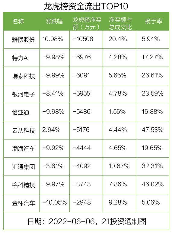 而龙虎榜中资金净流出最多的是雅博股份(002323.SZ),被净卖出为1.05亿元,占总成交金额的20.4%。雅博股份收盘上涨10.08%,换手率为5.94%。