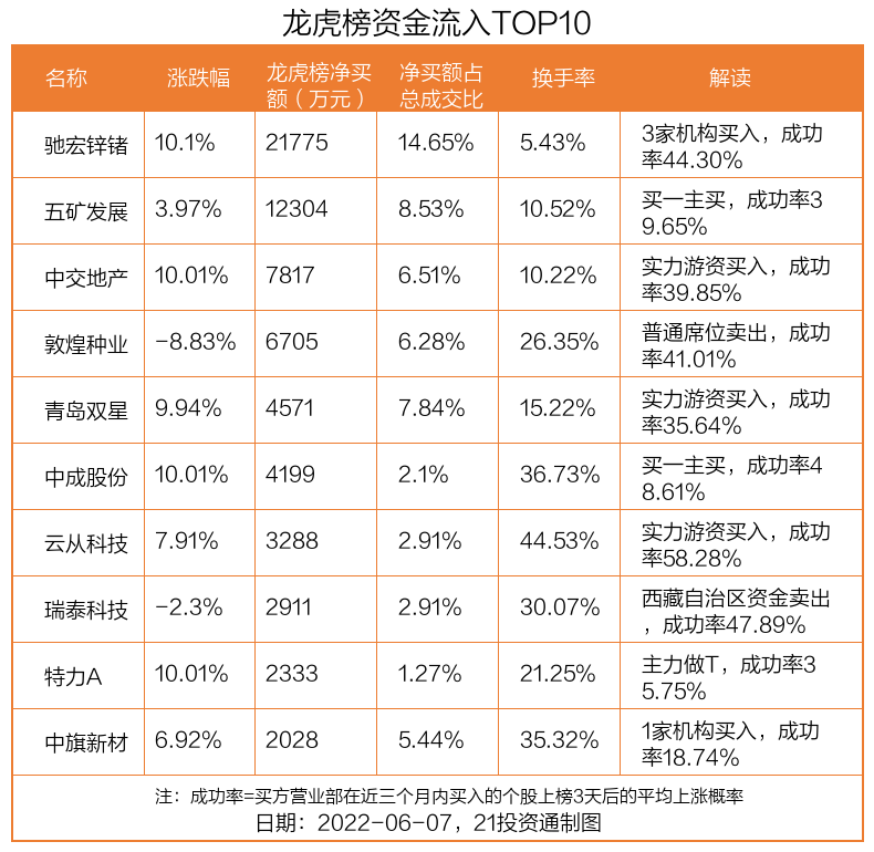 6月7日,上证指数上涨0.17%,深证成指下跌0.02%,创业板指基本以平盘报收。盘后龙虎榜数据显示,共有71只个股因当日异动登上龙虎榜,资金净流入最多的是驰宏锌锗(600497.SH),达2.18亿元。