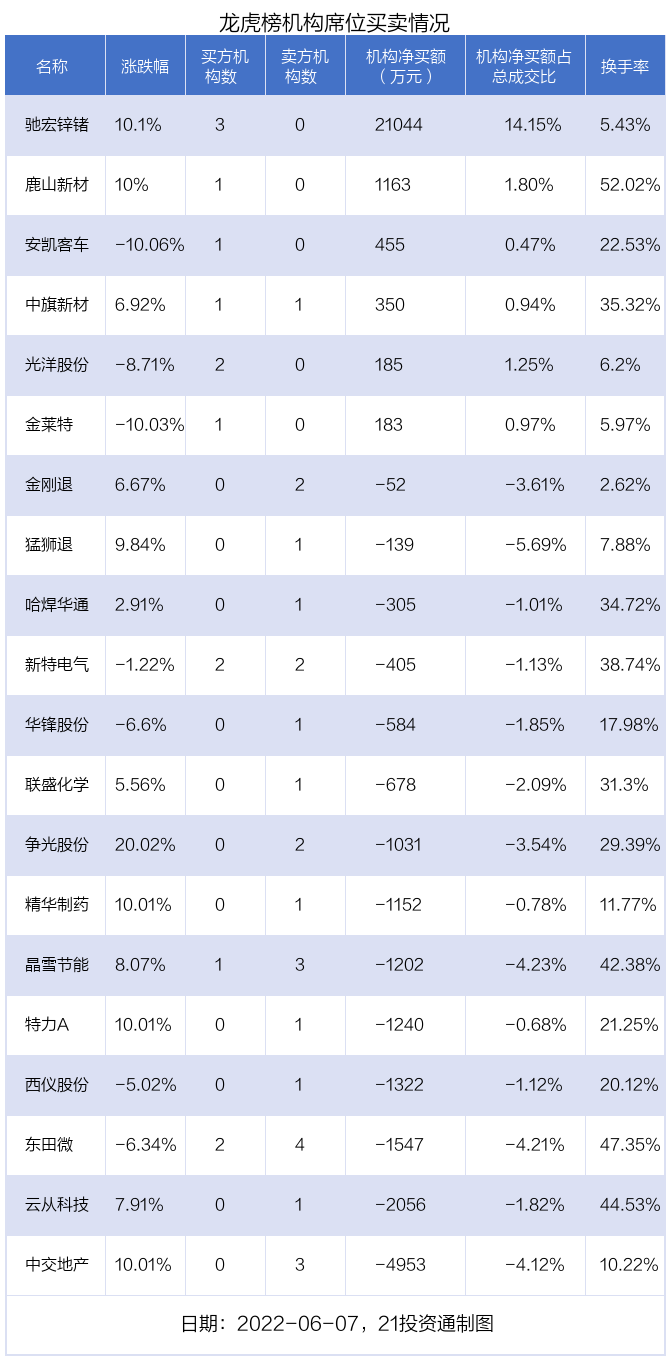 6月7日,20只个股龙虎榜出现了机构的身影,机构合计净买入6715.71万元。具体来看,机构净买入6股,净卖出14股。