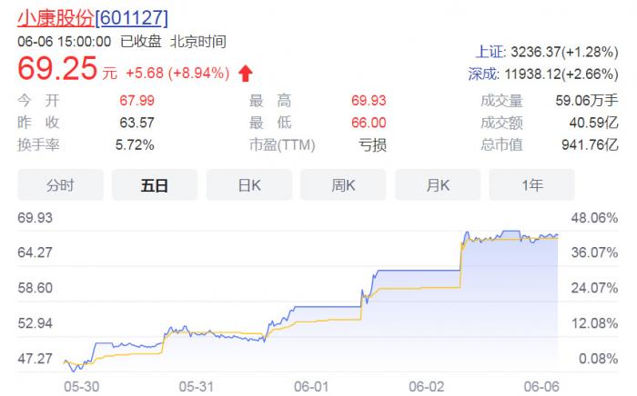 端午节假期后第一个工作日,6月6日,小康股份开盘涨停,收盘涨幅略有回落,5个交易日涨了46.6%。