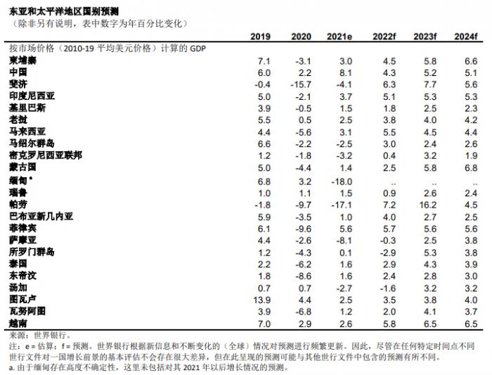 受国内需求走强和大宗商品价格上涨的支撑,报告显示,预计2022年印尼经济增长将回升至5.1%,2023年达到5.3%。泰国经济预计将在未来两年里逐步恢复,2022年增速回升,2023年达到4.3%。在持续的公共投资和家庭消费复苏支撑下,预计菲律宾2022年增长率将达到5.7%,然后在2023年略下降至5.6%。马来西亚由于疫苗接种率高,2022年内需将有所改善,经济增长将反弹至5.5%,但2023年由于出口减弱以及财政、货币政策收紧而放缓至4.5%。预计越南经济将随着疫情管控措施的解除而恢复活力,2022年增长5.8%,2023年进一步提高至6.5%。