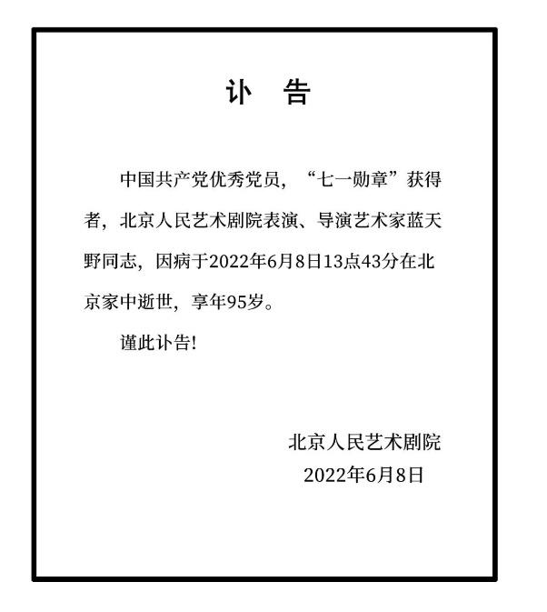 今天下午,中国共产党优秀党员,“七一勋章”获得者,北京人民艺术剧院表演、导演艺术家蓝天野,因病在北京离世,享年95岁。送别老艺术家,一路走好!