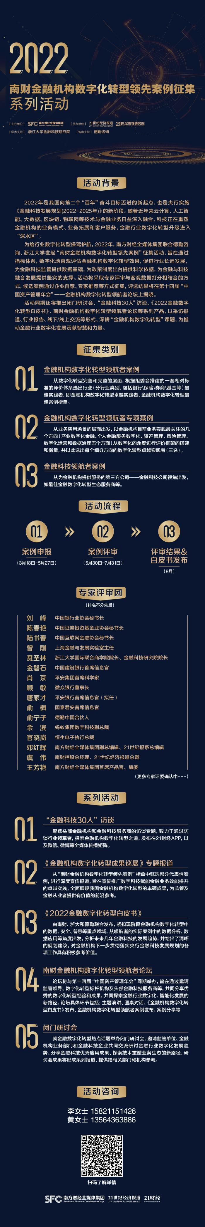 除案例征集外,《21世纪经济报道》还将甄选部分代表性案例进行《金融机构数字化转型成果巡展》专题报道,推出《2022金融数字化转型白皮书》,并推出“金融科技30人”访谈、南财金融机构数字化转型领航者论坛、闭门研讨会等系列产品,以采访报道、行业报告、线下/线上交流等形式,深耕“金融机构数字化转型”课题,为推动金融行业数字化发展贡献智慧和力量。