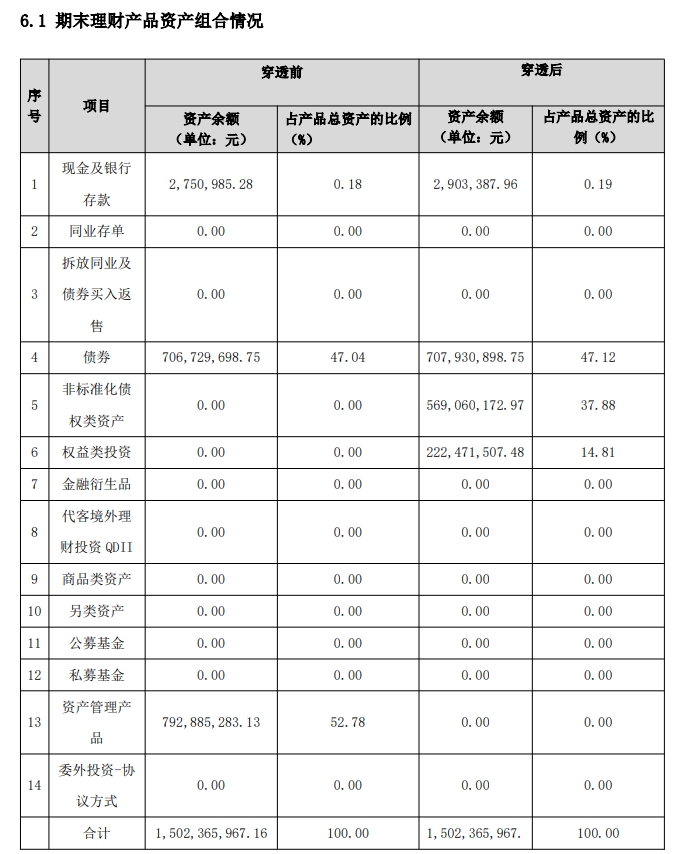从一季度末穿透后的资产配置情况看,该产品固定收益资产占总资产比例的为85.19%,其中包含47.12%的债券类资产、37.88%的非标类债券资产以及 0.19%的现金类资产。另外,权益类投资占比14.81%。相比于2021年末,产品的资产组合变化不大。