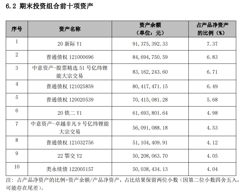 具体来看,产品前十大持仓中包括四项“普通债权”类信托产品,三项可续期公司债券"20新际Y1"、“20铁二Y1 ”、“22鄂科Y2”,两项资产管理类产品以及一项非标资产"类永续债122005157” 。