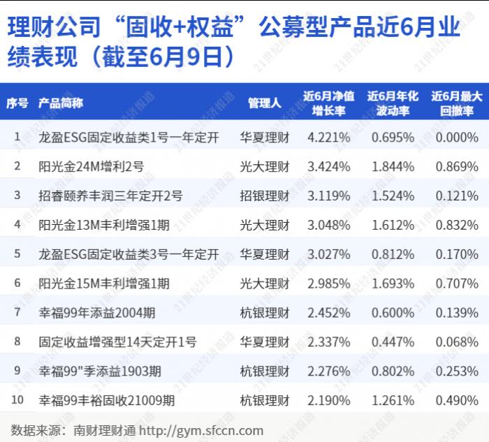 在理财公司“固收+权益”公募型产品近6月业绩榜单中,华夏“龙盈ESG固收1号一年定开”、光大“阳光金24M增利2号”以及招银“招睿颐养丰润三年定开2号”产品跻身榜单前三,近6月净值增长率达4.21%、...