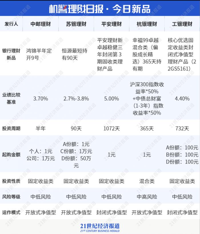 南财理财通课题组选取5只正在发售的新品供参考。据南财理财通数据显示,杭银理财“幸福99卓越混合类(偏股成长精选)365天持有期理财计划”值得关注。该产品投资性质为混合类,运作模式为开放式,风险等级为R4(中高风险),业绩比较基准为“沪深300指数收益率×50%+中债总财富(1-3年)指数收益率×50%”,认购起点为1元。