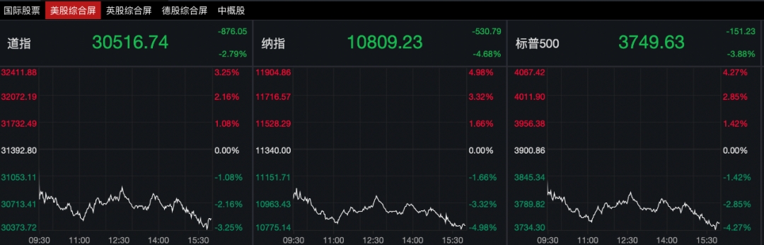 隔夜的美股市场遭遇的抛售尤为猛烈,截至收盘,道指重挫近880点,跌幅达2.79%;纳指暴跌4.68%,从52周新高跌超33%,至2020年9月来最低;标普500指数大跌3.88%,较52周内的新高累计跌幅超21%,正式跌入熊市。