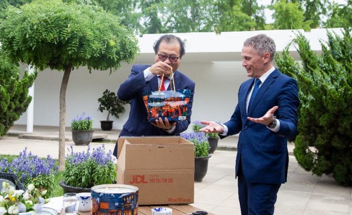 来自中国国际贸易学会的金旭会长在京东订购了丹麦知名牛油曲奇,因此受邀来到丹麦使馆,在北欧与中式建筑风格融合的官邸后花园,丹麦大使马磊先生亲自派发订单。近年来,来自丹麦的饼干、奶粉、益生菌、啤酒、保健品等产品受到中国消费者的喜爱,京东丹麦国家馆也为消费者提供了更多品质产品选择。今年618预售期间,丹麦食品在京东销量同比增长98%。马磊大使表示,“好物推荐官”的名头非常贴切,他将积极履职把更多好物推荐给中国消费者。