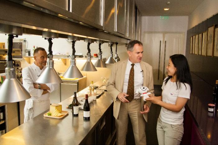 在京东购买了勃艮第黑皮诺葡萄酒的杨女士从法国农业参赞白峰朔手中完成收货。在参赞陪同下,杨女士还参观了法国大使官邸后厨,观赏厨师长欧文先生制作法式香煎三文鱼。为呼应法国弗朗什孔泰大区与安徽省结成的友好省区关系,白峰朔参赞和京东互换了分别来自两个地区的地标产品:法国孔泰奶酪和安徽霍山黄芽茶。孔泰奶酪是法国最知名的高山奶酪,从13世纪以来采用传统工艺制作,在不同季节不同农场采集的牛奶所做出的奶酪各具风味,是法国人最喜爱的干酪之一。京东618预售期间数据显示,法国国家馆销量同比增长近220%,而欧洲进口奶酪整体增长近250%。