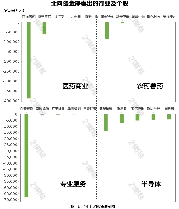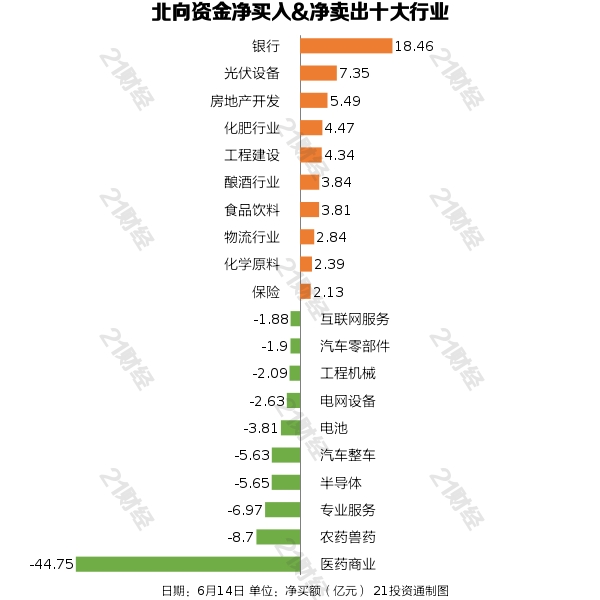 北向资金减持了42个行业,其中医药商业最多,净卖出金额达44.75亿元,其次是农药兽药行业,净卖出8.70亿元。