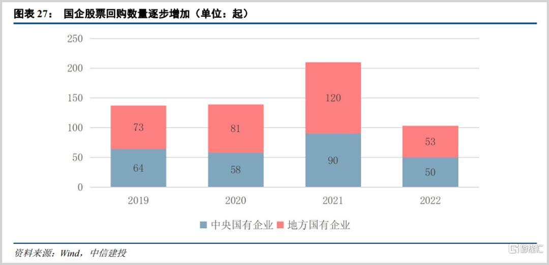 根据中信建投的统计,2019-2021年国企股份回购预案数量稳步增长,在2021年更是达到210起的高潮。而截至今年6月4日,国企股份回购预案已经达到103起。