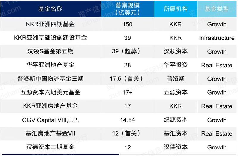 2021年,普洛斯多支人民币基金和美元基金完成募集,最为突出,盈科资本、KKR等机构紧随其后。另外,凯辉基金旗下凯辉创新基金二期在年初以6.5亿欧元超募完成。