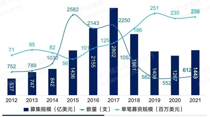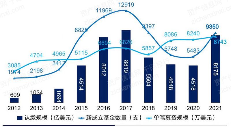 图 2012年-2021年新成立基金数量及认缴规模变化