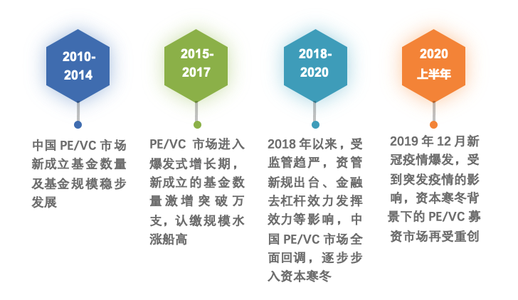 纵观近十年数据,2014年之前我国募资市场仍处于起步阶段,虽基金数量及规模在逐年攀升,但进展缓慢。自2015年起,各大金融机构资管业务发展迅速,发展规模不断扩大,截至到2017年末即资管新规推出前,我国的资管规模已经达到了百万亿元,基金数量翻倍上升,新成立基金数量超万支,但过快的增速暴露出一些行业乱象,风险也在积聚。