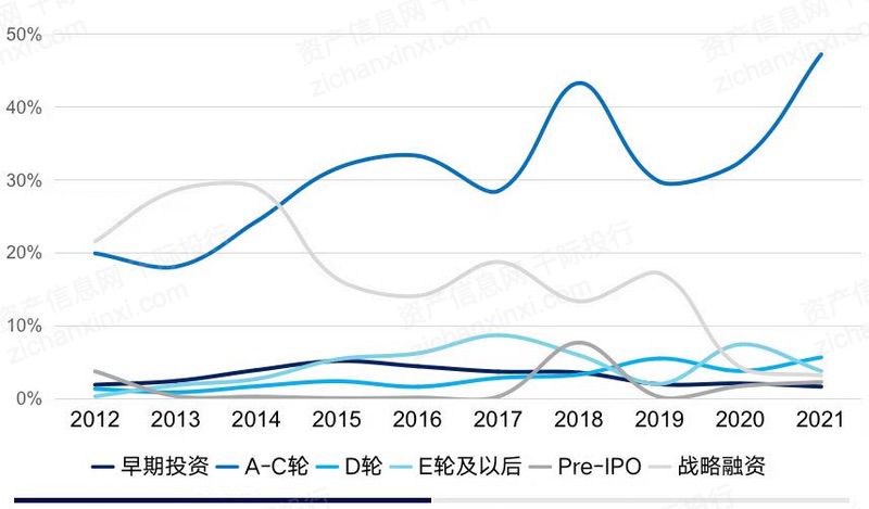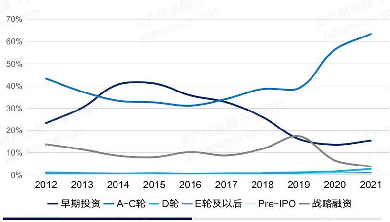 图 2012年-2021年中国VC/PE市场投资各轮次事件数量比重变化