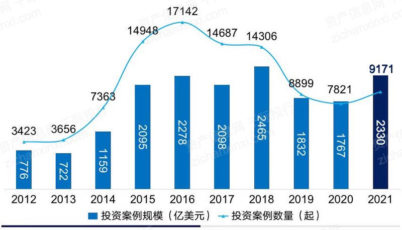 2021年,投资案例数量9171起,同比上升17%,投资案例规模2330亿美元,市场整体回温显著。自2018年资管新规出台后,中国VC/PE市场整体呈下沉趋势,紧接而来的疫情,让资本寒冬再度持续,2021年在疫情的有效控制和政策的不断完善下,市场的紧张气氛逐渐缓解,资本出手愈发大方。