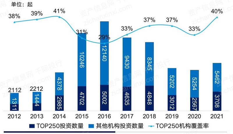 图 2012年-2021年TOP250机构投资交易数量占比市场覆盖率