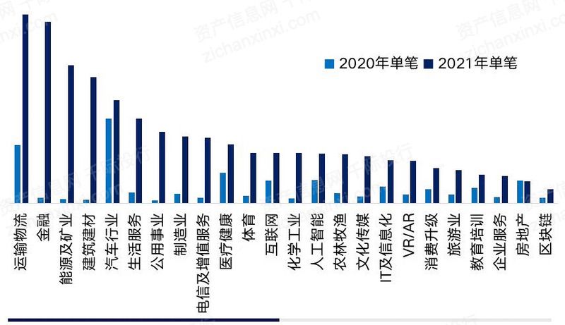 2021年,大部分行业投资均值持续走高,尤其在运输物流、金融、能源、建筑建材、汽车等领域。其中,排除极兔速递、万达商管等超大额案例后,市场交易规模仍升温显著。在众多行业中,建筑建材行业涨幅最高。
