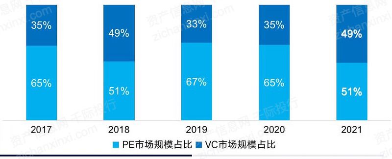 图 2017年-2021年中国VC/PE市场投资规模占比