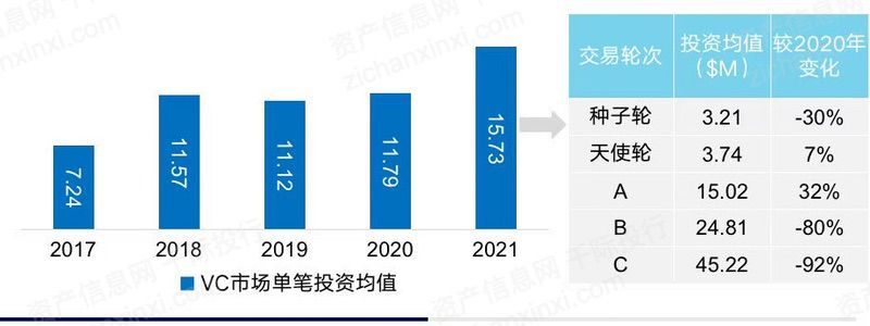 本期VC市场投资均值为15.73百万美元。细分轮次下,A轮交易均值涨幅最高,同比提升32%;C轮投资均值最高,高达45.22百万美元,与此同时交易均值跌幅也最高,同比下降92%。