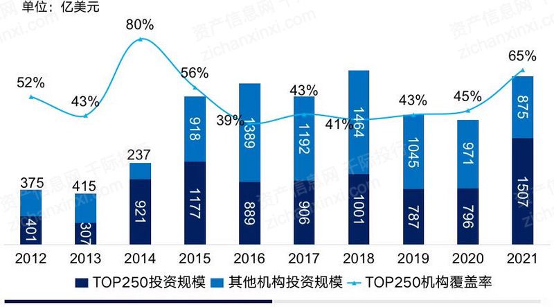 图 2012年-2021年TOP250机构投资交易规模占比市场覆盖率