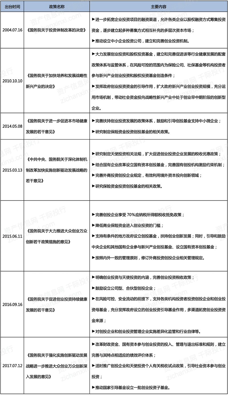 为支持创业投资行业的发展,国务院在顶层设计层面提出了一系列扶持创业投资的鼓励政策: