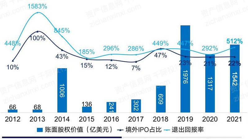 图 2012年-2021年VC/PE机构IPO方式退出账面回报及境外IPO占比