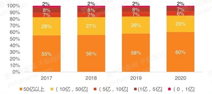 根据在中基协备案的数据显示,50亿规模以上的私募股权基金管理人管理规模从2017年的55.2%提升至2020年的60.4%,10 亿规模以上的管理人管理规模从2017年的82.8%提升至2020年的85.2%,行业集中度持续提升。