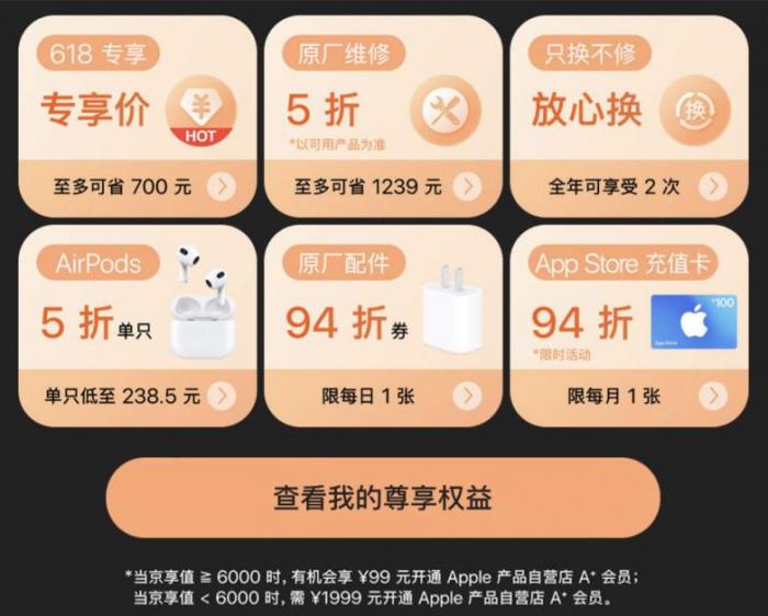 此外,A+会员还将享受原厂维修5折、1年2次享受只换不修服务、购买原厂配件94折优惠、AirPods单只5折等权益保障。京享值≥6000有机会以99元开通。