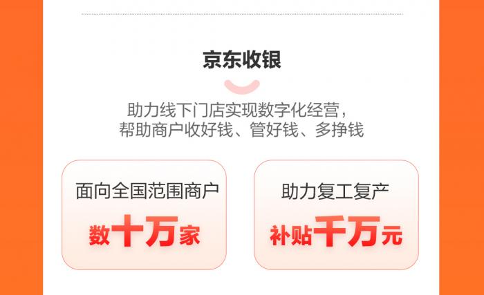 京东收银也推出了助力复工复产的补贴包,对全国范围数十万家商户补贴千万元。京东收银通过为中小微企业和商家提供门店周边收银硬件减免、餐饮商户扫码点单手续费减免等,打造安全、高效、稳定的以收银为核心的一站式门店数字化产品和服务,帮助商户收好钱、管好钱、多挣钱。商家通过京东收银APP还可享受软件赠送、优惠进货、优惠借钱等多项服务支持。