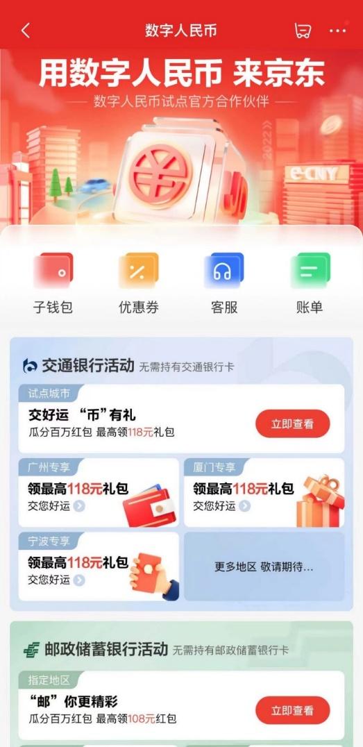 除了京东科技携手交通银行、邮储银行、平安银行的数字人民币红包活动外,京东618期间,雄安新区、成都的用户还可在京东叠加领取当地政府发放的数字人民币消费券,享受多重福利。比如,雄安新区的消费者可参与雄安新区管委会与京东合作的“雄安新区绿色智能家电消费季”活动,登陆“中国雄安官网”微信公众号进入活动专区领取数字人民币消费券,在京东线上购买家电得最高减500元;成都“520”数字人民币线上消费券活动,则是六月每周五12:30到23:59,用户可在京东专区领取满100元减30元、满300元减80元、满2000元减300元和满5000元减600元的消费券。