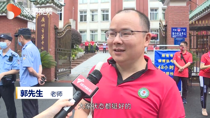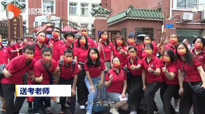 在广州市第十七中学的门口,今天一早,老师和家长们就围成了一条击掌送考通道,为同学们加油助威,气氛热烈。记者在现场看到,不少送考队伍都穿上了红色的衣服,戴着红色的口罩,寓意着好运当头,旗开得胜。
