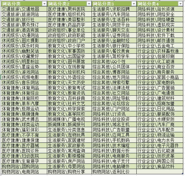 网站按照Alexa分类为12大类和127小类,也可以按照国家分类。