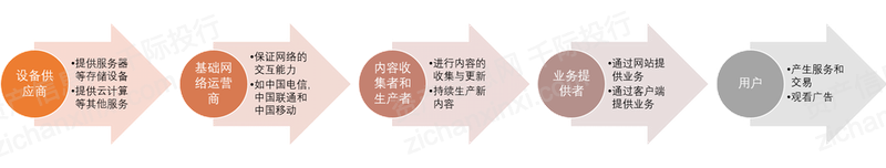 互联网产业链主要可以分为设备供应商,基础网络运营商,内容的收集者和生产者,业务提供者以及用户。其中设备供应商和基础网络运营商属于互联网行业的上游,属于维护和制定互联网。内容生产者属于中游,而业务提供者属于下游。