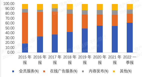 参考爱奇艺的报表,爱奇艺是一个视频娱乐提供公司,也是中国一个较大的视频网站公司。可以看出伴随着广告收入比重下降,会员服务占其收入的比例越来越高。因此近年来爱奇艺的主要收入来源从广告变成了会员服务。