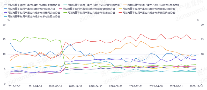 根据2019年后的网站流量数据并依据兴趣内容划分网站,可以看出大部分兴趣内容的网站用户较为恒定,流量比较稳定。