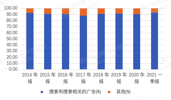参考搜狗搜索引擎的报表,可以看到搜狗的业务收入主要来源与广告业务,占比普遍超过百分之85。