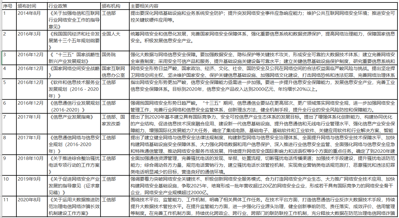 我国网络与信息安全行业相关管理部门包括工业与信息化部、网信办、公安部、国家保密局。工信部负责拟定实施行业规划,产业政策和标准;指导推进信息化建设;协调维护国家信息安全等;指导软件业发展;拟定并组织实施软件、系统集成及服务的技术规范和标准;推动软件公共服务体系建设;指导、协调信息安全技术开发等。网信办着眼国家安全和长远发展,统筹协调涉及经济、政治、文化、社会等各个领域的网络安全和信息化重大问题;研究制定网络安全和信息化发展战略、宏观规划和重大政策;推动国家网络安全和信息化法治建设,不断增强安全保障能力。公安部主管全国计算机信息系统安全保护工作。保密局负责管理和指导保密技术工作,对从事涉密信息系统集成的企业资质进行认定。