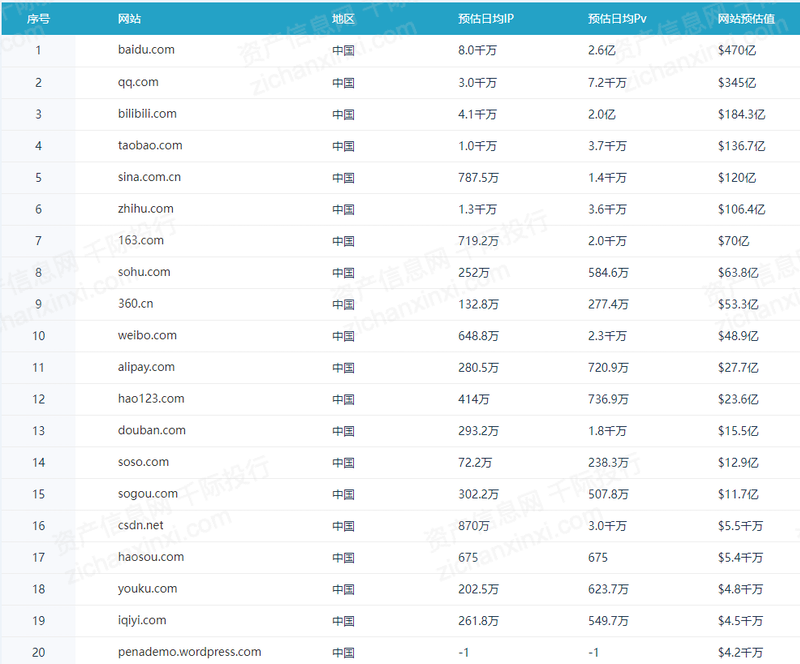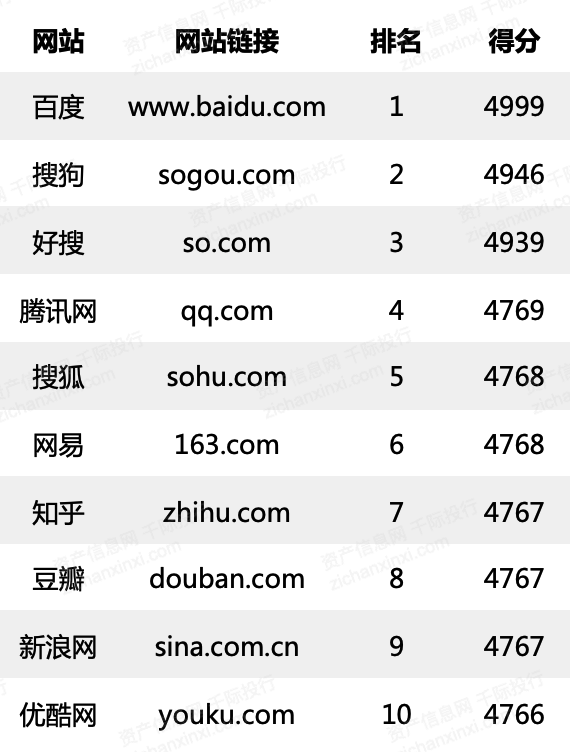 根据Alexa周排名、百度权重、PR、反链数的综合评分,可以得到相对客观的排名。其中中国排名前10的网站中,有3个搜索引擎,6个综合门户网站以及1个狭义门户网站。