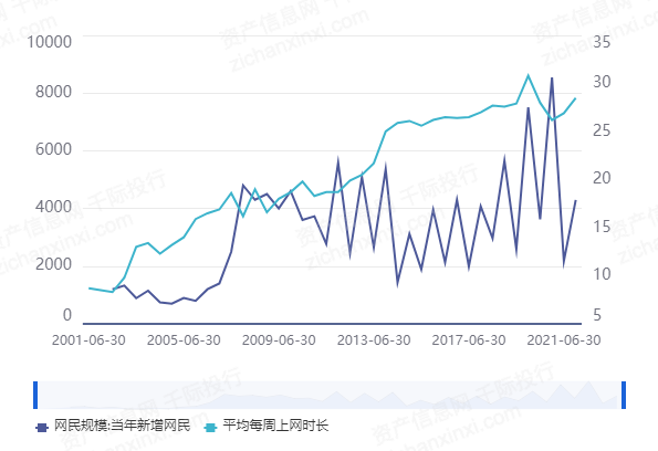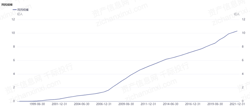 根据宏观数据可以看出,过去20年间,网民数量在不断增加。截止2021年12月31日,我国已有10.31亿网民,相比起2019年3月31日上升1.28亿人。网民人数上升对于互联网的总体需求有较大提升。除此之外,网民的人均上网时间也处于上升趋势。截止2021年6月30日,中国网民的每周平均上网时间已经达到了28.5小时。