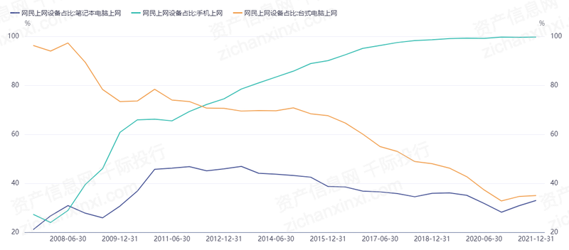 上网设备主要分为手机,台式电脑以及笔记本电脑。其中手机使用浏览器访问网站相比起台式及笔记本电脑较为麻烦,因此手机上网通常采取小程序和APP。因此台式电脑和笔记本电脑的使用程度往往能反映网站行业的需求端。